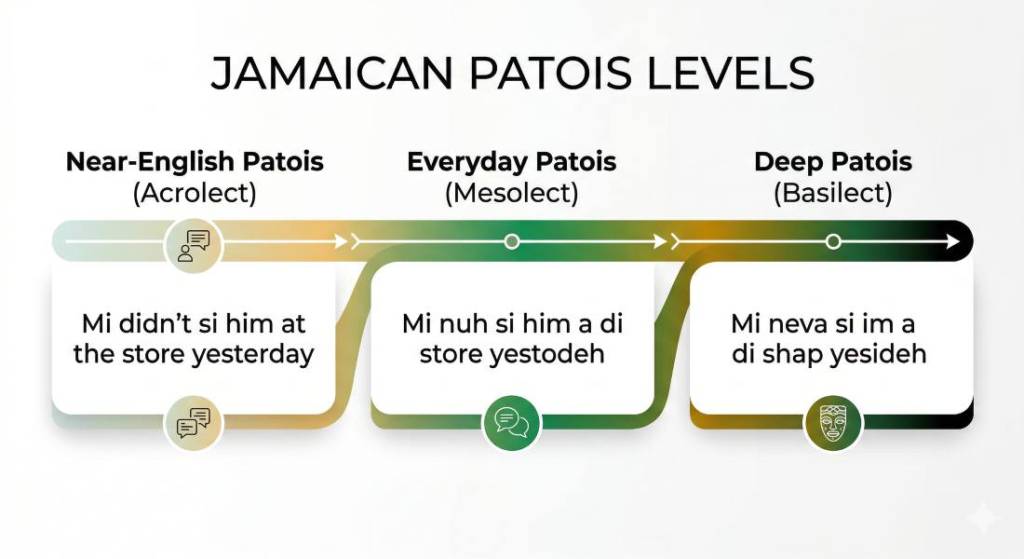 Jamaican Patois is not a single fixed way of speaking. It exists on a spectrum. Linguists describe this using three main terms: acrolect, mesolect, and basilect.